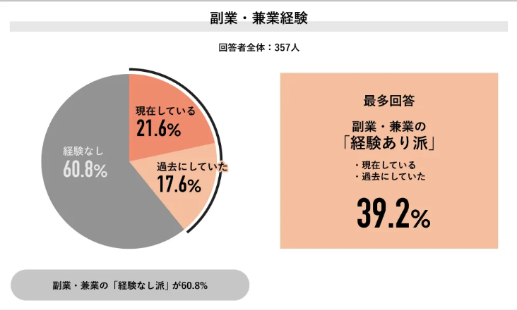 まず背景として、副業への関心は年々高まっています。Job総研が2025年に実施した「副業・兼業の実態調査」(357人対象)では、副業経験者が約4割に達し、今後も副業を「始めたい・続けたい」と考える人は7割以上にのぼることが明らかになりました(出典:Job総研『2025年 副業・兼業の実態調査』)。副業は一部の人だけのものではなく、会社員にとっての一般的な選択肢になりつつあります。