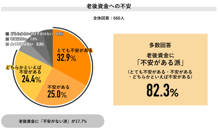 実際、Job総研が2024年に実施した「老後資金の意識調査」(660人対象)によると、全体の82.3%が老後資金に「不安あり」と回答しています。不安の理由として最も多かったのは「年金の受給有無」で、年金だけに頼れないという危機感は、いまや多くの会社員に共通する悩みです。
